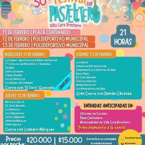 NOCHES BROCHERIANAS Semana del 2 de Febrero al 8 de Febrero. Plaza Centenario. 20:00 horas: Espectáculo Infantil. 22:00 horas: Academias de Bailes / Show Musical / Artistas locales e invitados