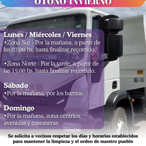 La Municipalidad de Villa Cura Brochero informa los horarios de Recolección de Basura en Temporada Otoño-Invierno. El servicio se brindará en unidades por los diferentes barrios y zona céntrica de