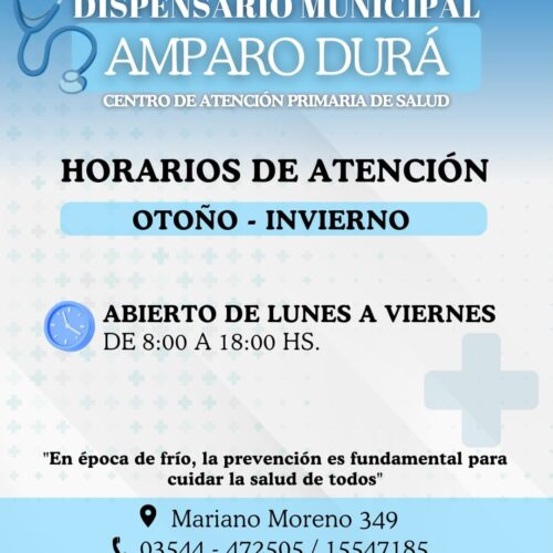 ESPECIALIDADES Y MÉDICOS EN DISPENSARIO MUNICIPAL (CAPS) La Municipalidad de Villa Cura Brochero informa a la comunidad que durante los próximos días y meses el Dispensario Municipal Amparo Durá, atenderá
