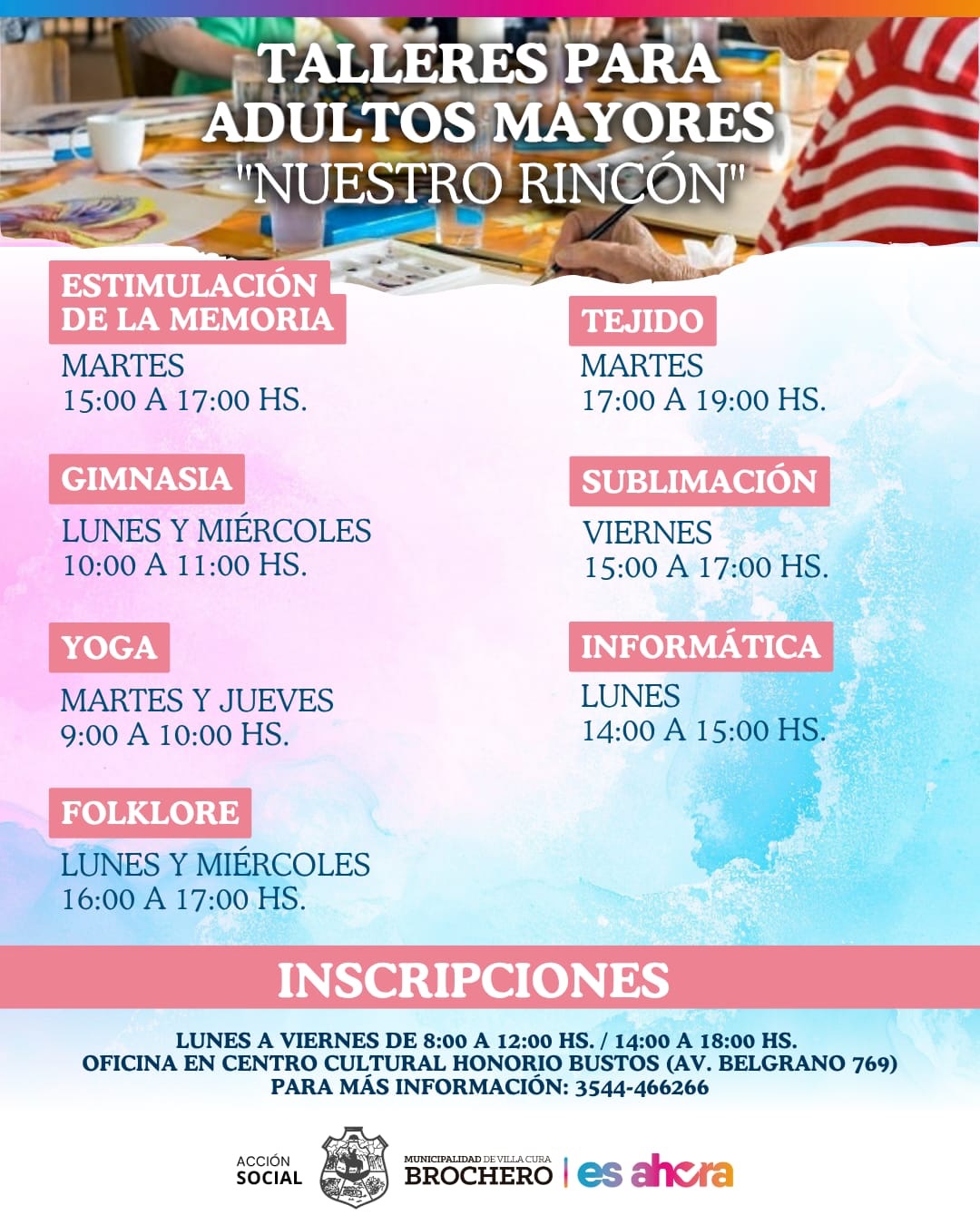 La Municipalidad de Villa Cura Brochero y el Espacio para la Promoción de Adultos Mayores “Nuestro Rincón” invitan a vecinos mayores de 60 años a sumarse y ser parte de los talleres que se dictan en el Centro Cultural Honorio Bustos.