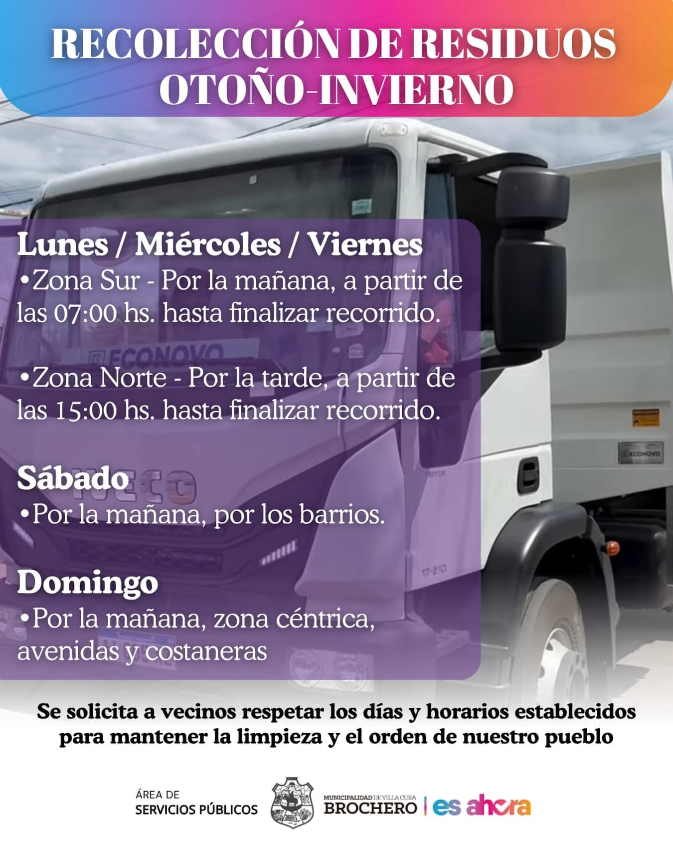 La Municipalidad de Villa Cura Brochero informa los horarios de Recolección de Basura en Temporada Otoño-Invierno. El servicio se brindará en unidades por los diferentes barrios y zona céntrica de la localidad, por la mañana y tarde.
