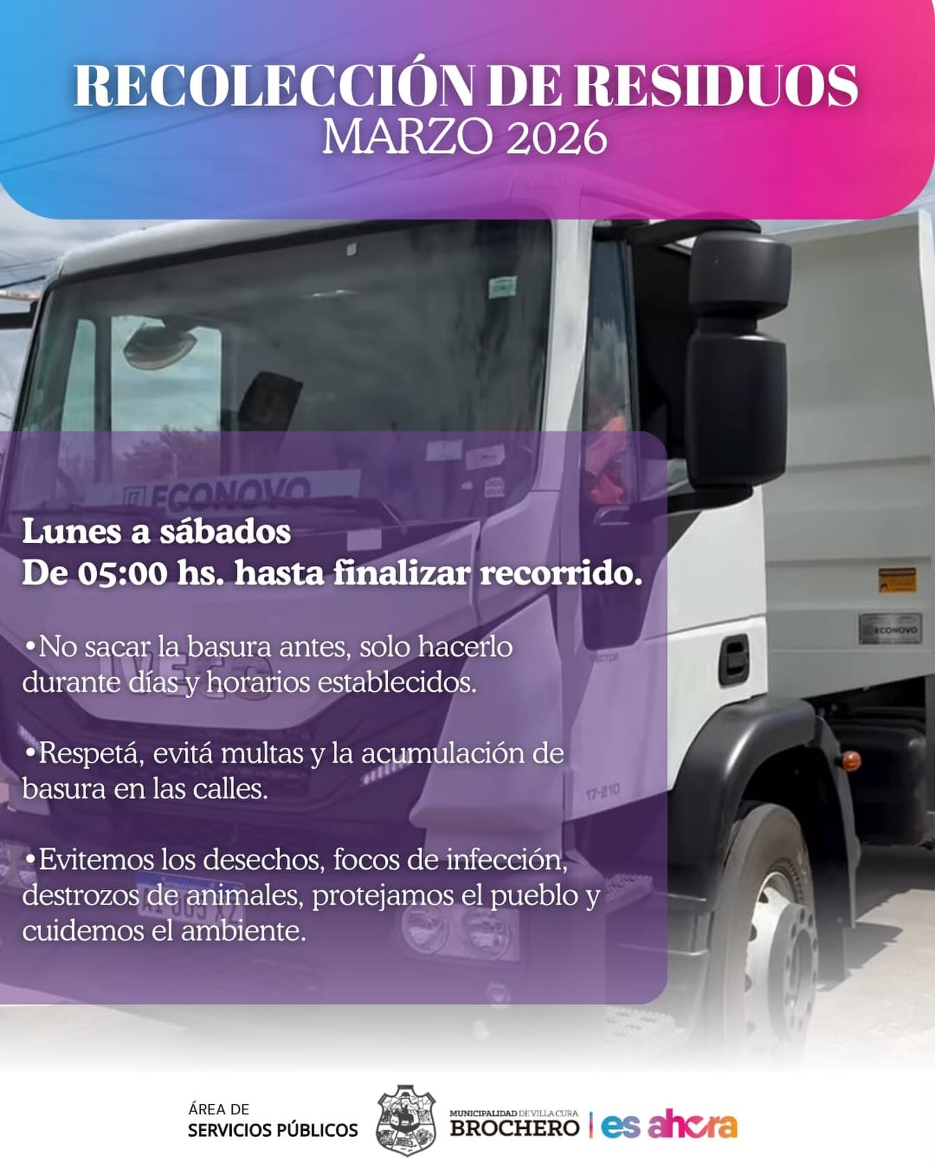 La Municipalidad de Villa Cura Brochero informa a la comunidad los días y horarios de Recolección de Residuos durante el mes de Marzo del corriente año.