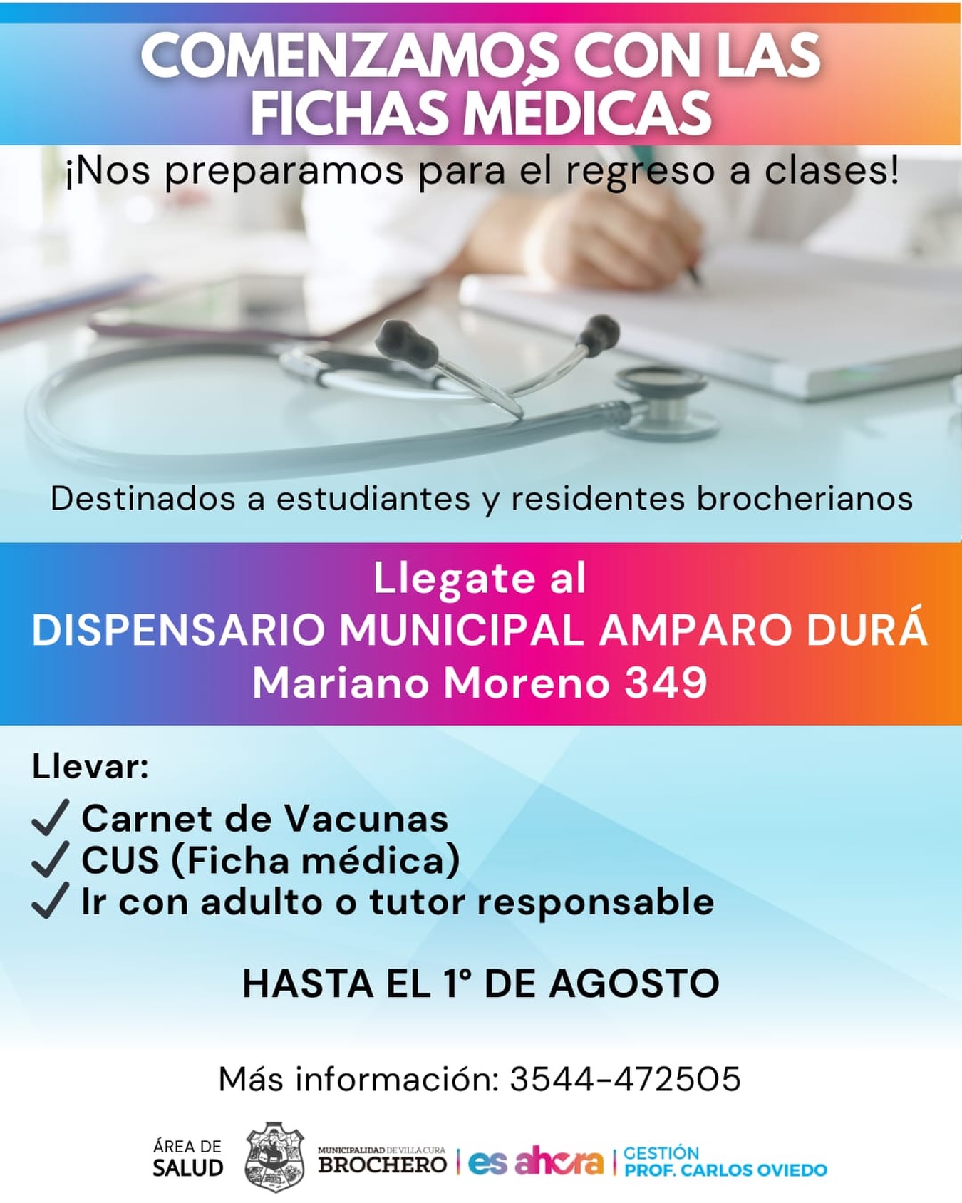 La Municipalidad de Villa Cura Brochero informa a la comunidad que ya se están brindando turnos y realizando Fichas Médicas Escolares en el Dispensario Municipal Amparo Durá.