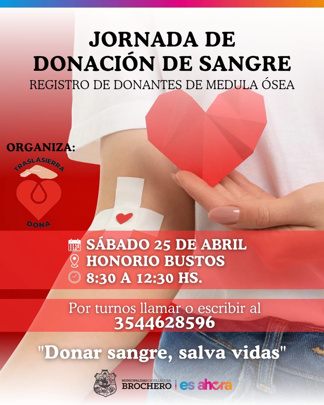 La Municipalidad de Villa Cura Brochero invita a la comunidad a sumarse a la Jornada Solidaria de Donación de Sangre y Registro de Donantes de Médula Ósea, organizada por Asociación Civil Traslasierra Dona, que tendrá lugar el sábado 25 de abriel, en el Centro Cultural Honorio Bustos (Av. Belgrano 769), de 08:30 a 12:30 hs.