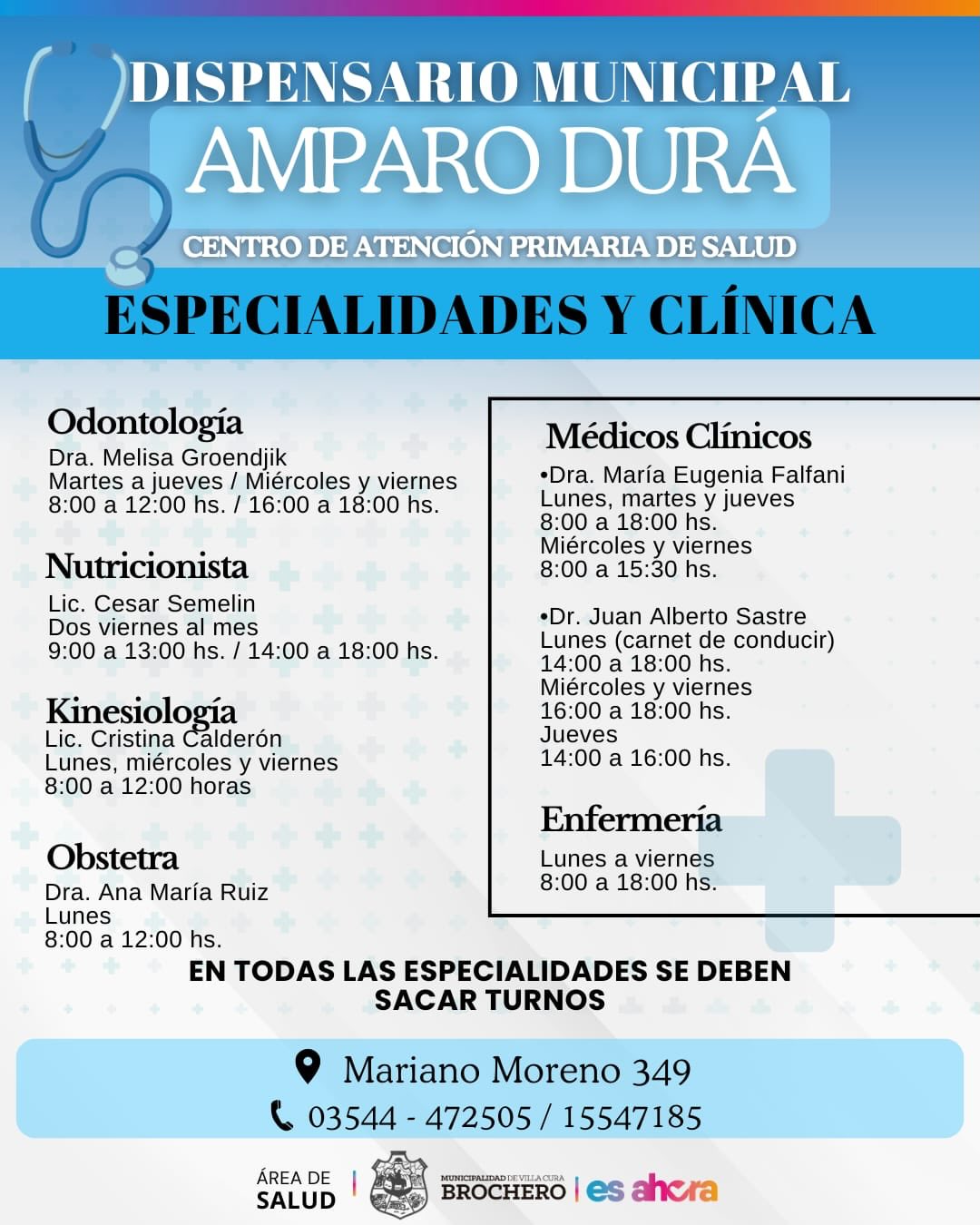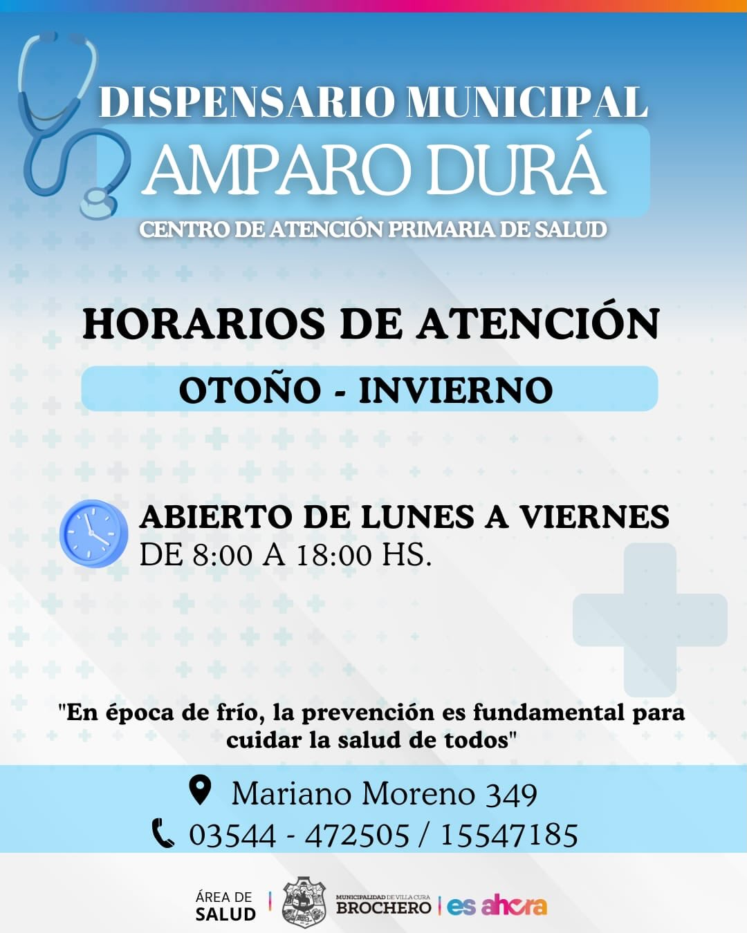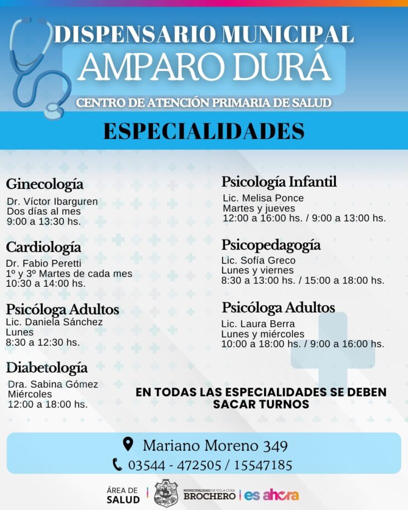 La Municipalidad de Villa Cura Brochero informa a la comunidad que durante los próximos días y meses el Dispensario Municipal Amparo Durá, atenderá de lunes a viernes, de 8.00 a 18.00 hs.