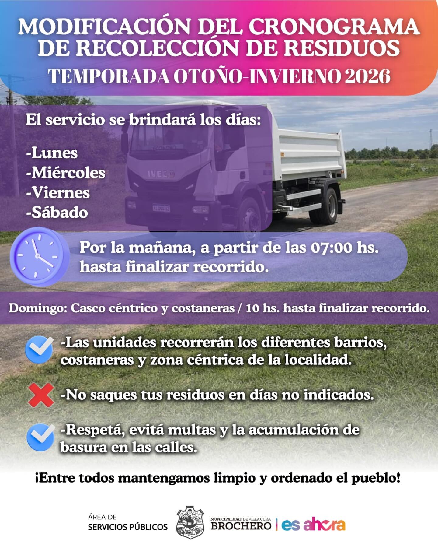 La Municipalidad de Villa Cura Brochero informa a los vecinos la modificación en los horarios de Recolección de Basura en Temporada Otoño-Invierno. El servicio se brindará en unidades por los diferentes barrios y zona céntrica de la localidad, por la mañana hasta finalizar recorrido.