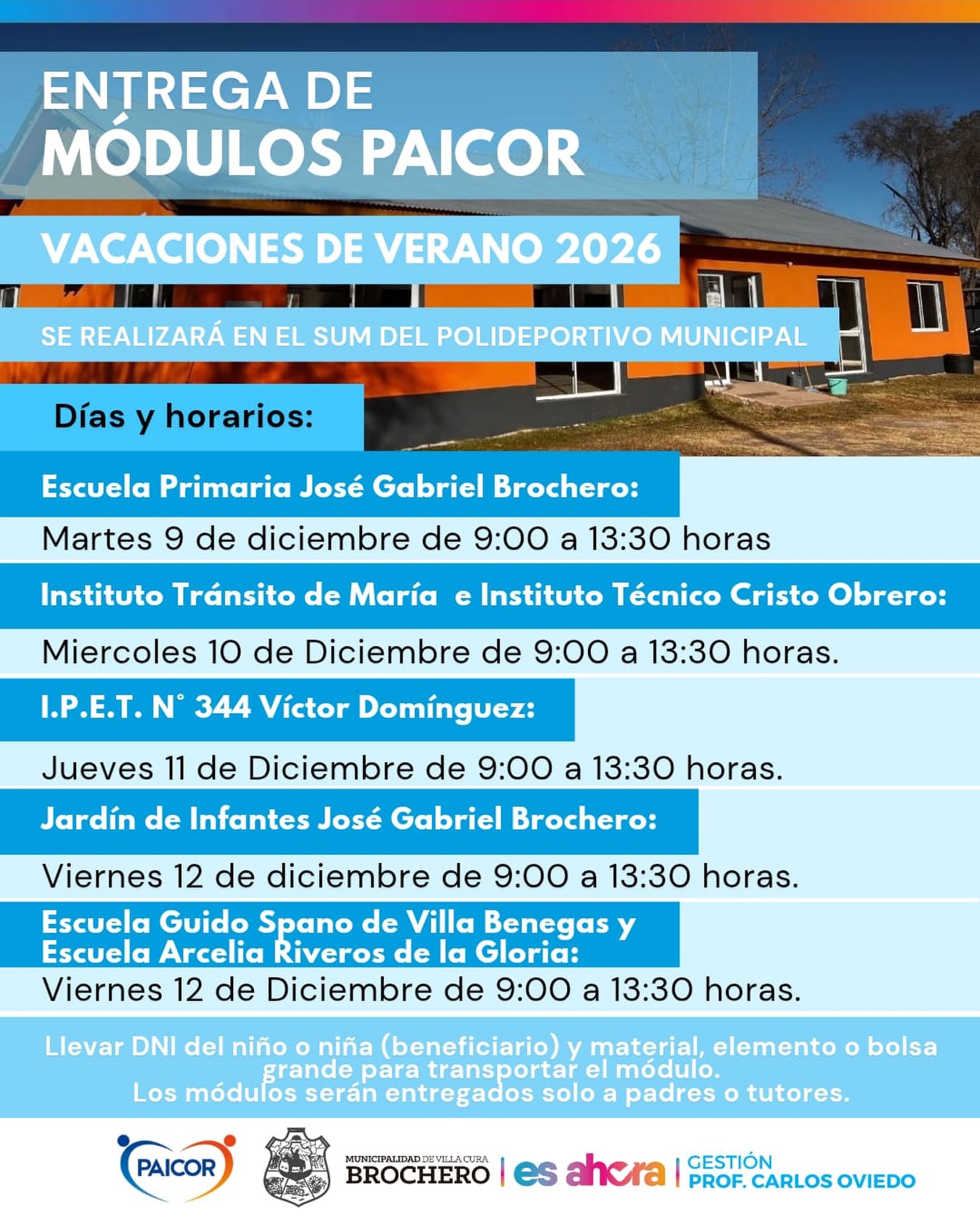 La Municipalidad de Villa Cura Brochero informa a los beneficiarios de PAICOR que se realizará la entrega de los módulos alimentarios correspondientes al receso escolar de verano,en el sum del polideportivo municipal.