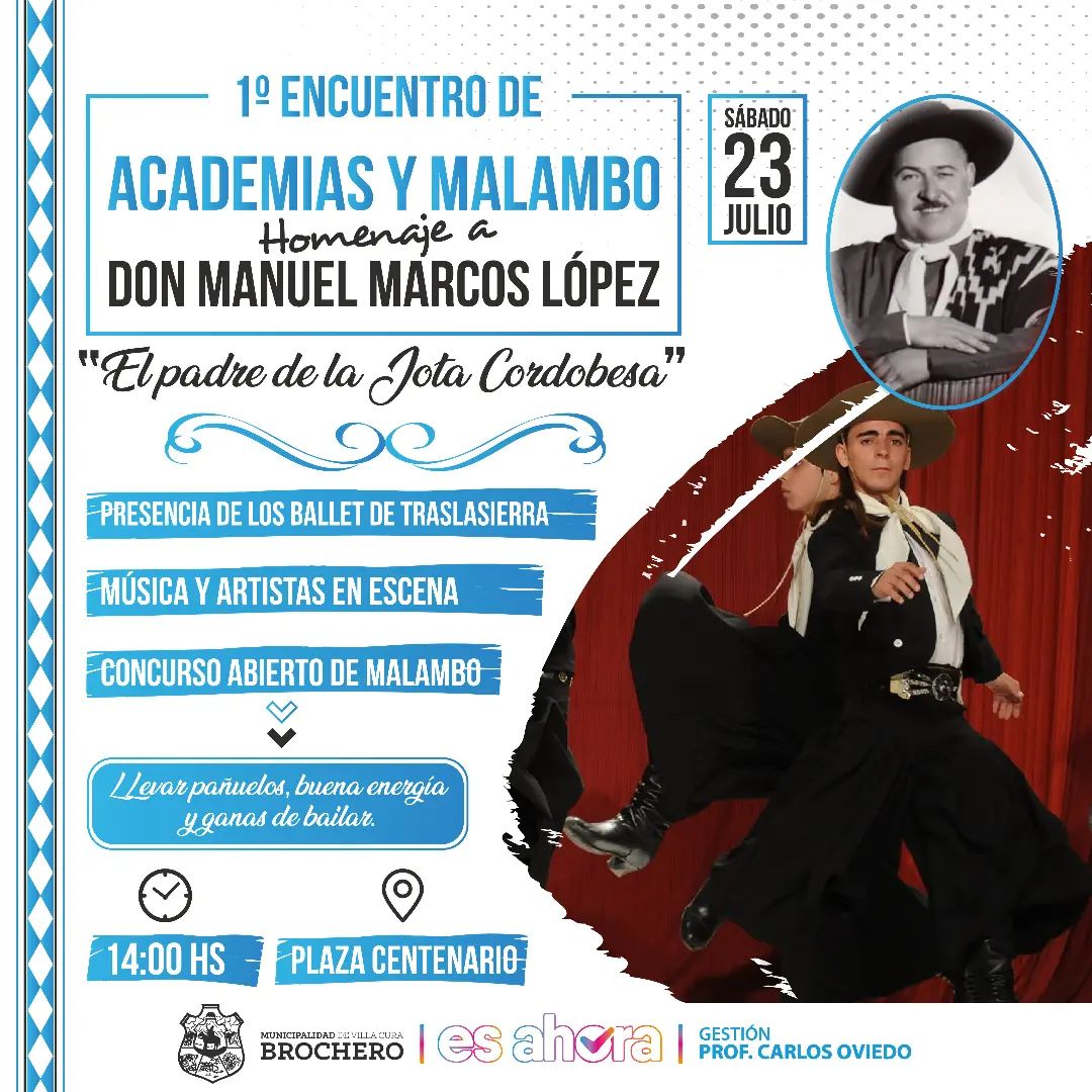 Encuentro de Danzas Folklóricas y Malambo de Traslasierra y del Homenaje de Don Manuel Marcos López, el padre de la Jota Cordobesa. El mismo se realizará el sábado 23 de julio, a las 14 horas en Plaza Centenario. Se realizará un Homenaje Musical a M. Marcos López, contaremos con la presencia de los diferentes Ballet de Traslasierra; habrá música y artistas locales y un concurso abierto de Malambo. ...