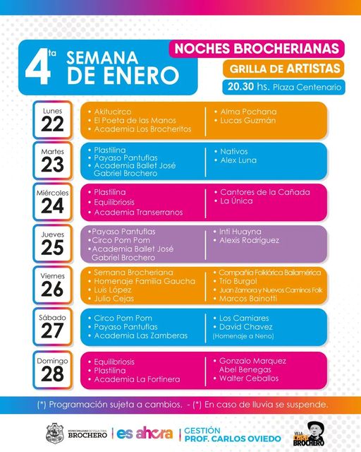 GRILLA ARTISTAS #Verano2024 5º Semana de Enero /1° Semana de Febrero Plaza Centenario. Lunes a domingo. 22:00 horas. Infantil. Academias de Bailes. Show Musicalm Artistas locales e invitados. Folklore. Cuarteto. Cierre Bailable. Programación sujeta a cambios o modificaciones. En caso de lluvia se suspende. Las NOCHES BROCHERIANAS son especiales. ...