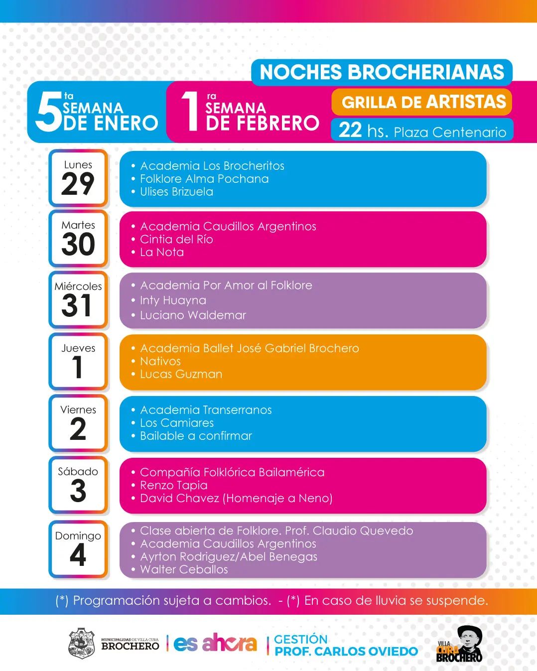 4º Semana de Enero. Plaza Centenario. Lunes a domingo. 20:30 horas - Payasos, Malabaristas, Títeres y Magos. (doble espectáculo) 22:00 horas - Academias de Bailes / Show Musical / Artistas locales e invitados /Cierre Bailable. Programación sujeta a cambios o modificaciones. En caso de lluvia se suspende. Las NOCHES BROCHERIANAS son especiales. En Verano ¡Conectá con Villa Cura Brochero! ...