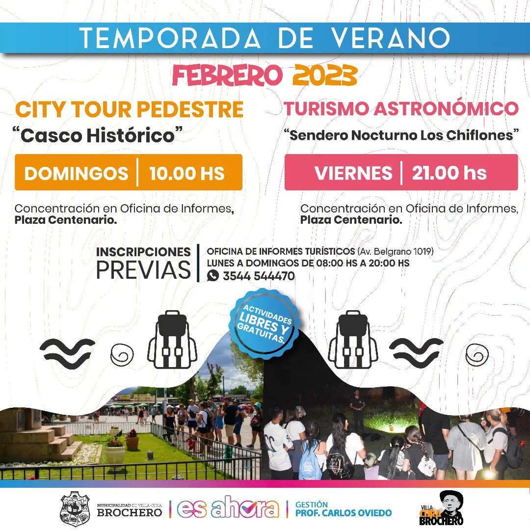 La Municipalidad de Villa Cura Brochero continúa invitando a vecinos, visitantes y familias a disfrutar de las actividades y propuestas turísticas de la Temporada de Verano. Son libres y gratuitas. Todos los viernes y domingos del mes de Febrero, sumate al senderismo con nuestros guías, recorre los lugares y caminos de Brochero, conoce su historia y legado y realizá diversas acciones. TURISMO ASTRONÓMICO “SENDERO NOCTURNO LOS CHIFLONES” -Viernes. -21:00 horas. -Concentración Plaza Centenario. -Llegada Acueducto Los Chiflones. -Observación Astronómica. -Dificultad Baja. CITY TOUR PEDESTRE “CASCO HISTÓRICO” -Domingos. -10:00 horas. -Concentración Plaza Centenario. -Recorrido por casco histórico. -Dificultad Baja. Inscribite previamente al 3544544470 o...