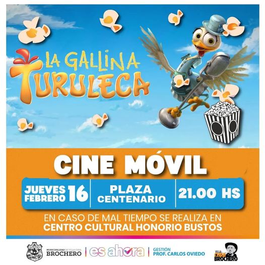 La Municipalidad de Villa Cura Brochero invita a vecinos y turistas a disfrutar del Cine Móvil. Es libre y gratuito. La proyección se realizará el jueves 16 de febrero, en Plaza Centenario, a las 21:00 horas. Se presentará la película Gallina Turuleca. Destinada a pequeños y familias. En caso de mal tiempo, se traslada al Centro Cultural Honorio Bustos (Av. Belgrano 769) ¡Los esperamos para pasar una noche maravillosa! En Verano ¡Viví Cura Brochero! ...